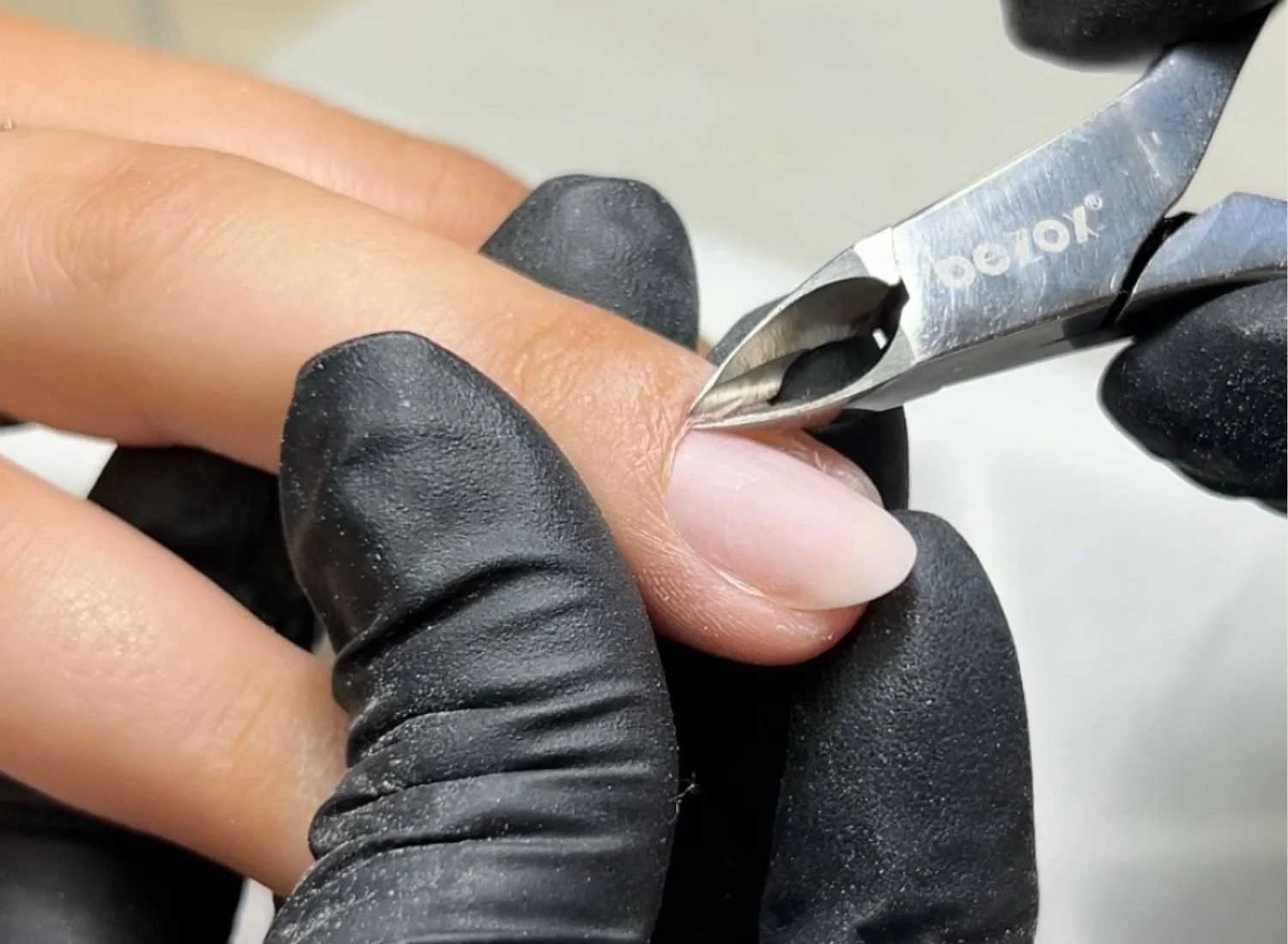 A close up shot of an Amiri nail tech carefully using cuticle clippers to nail their BIAB prep.
